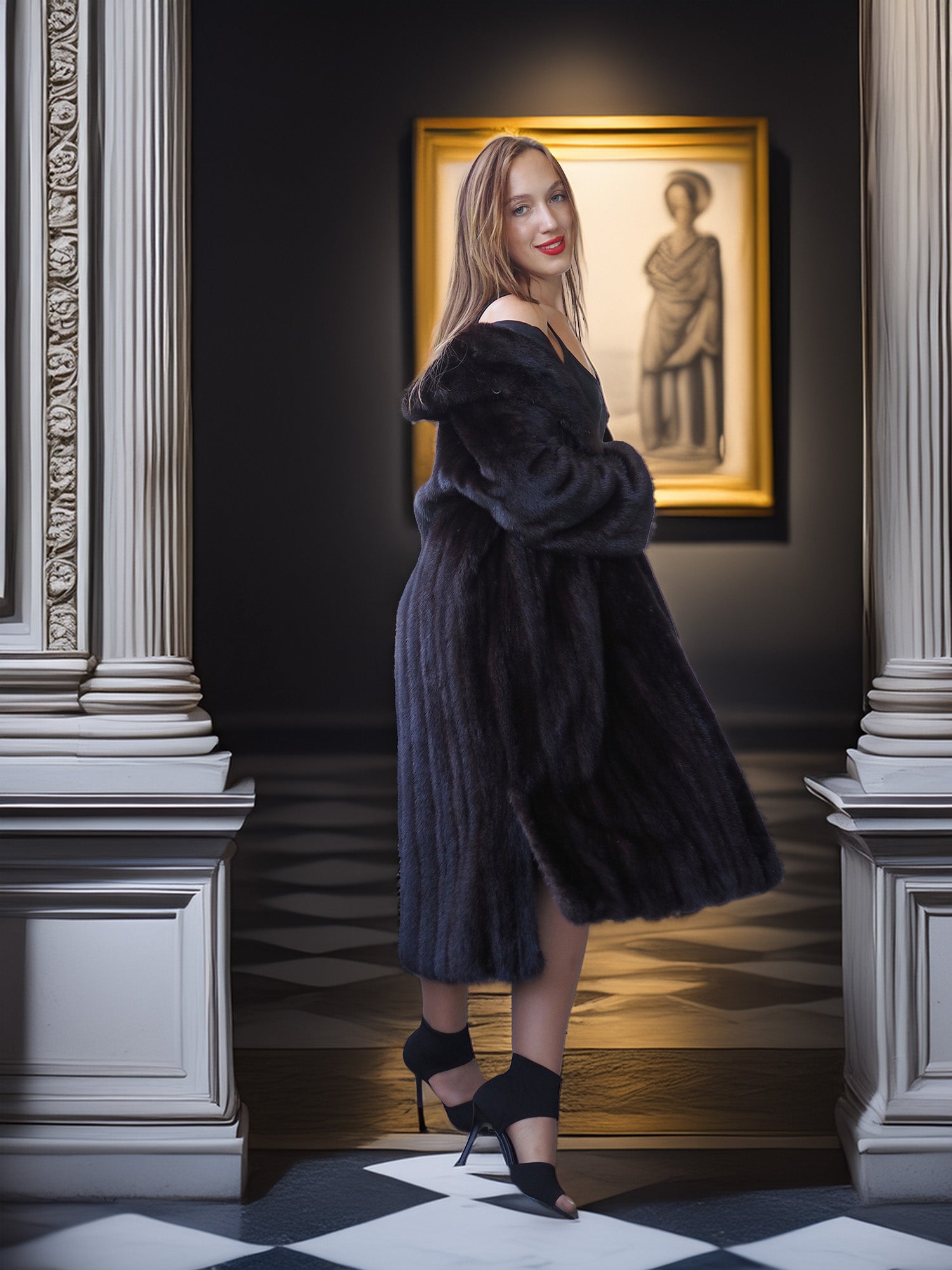 She steps through gilded doors and into the hush of history. "The Empress Gate" is a full-length black mink coat designed for a woman who doesn’t follow the rules—she sets them. With side slits tailored for movement and mystery, it sways like a whisper behind her. The plush texture of true black mink envelops her in unapologetic luxury, framed by a strong shoulder and classic collar. Whether she's disappearing into a museum’s golden corridor or appearing suddenly on the steps of a Parisian opera house, this coat doesn’t just dress her—it crowns her.
