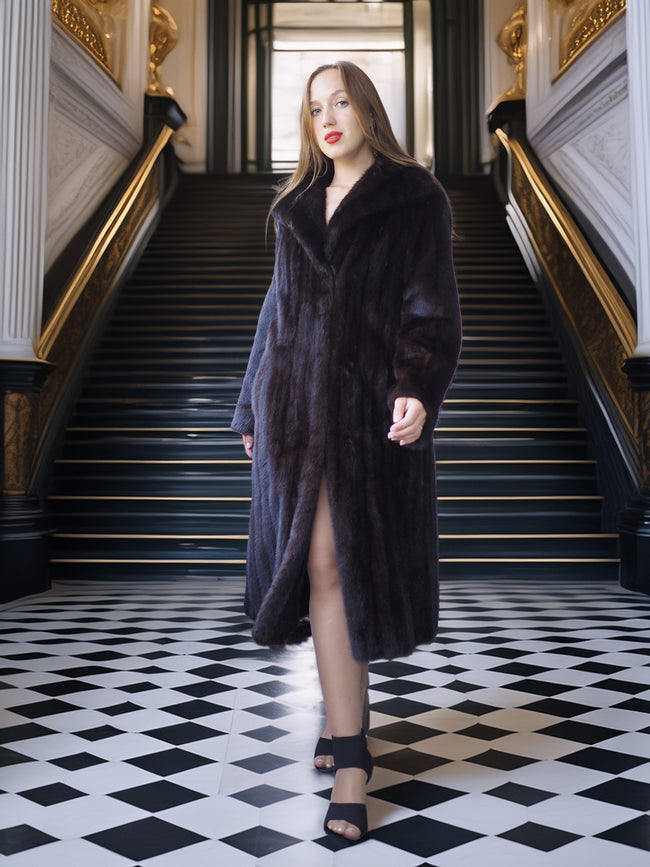 Perfect for fall and winter evenings, this vintage mink coat brings timeless elegance into modern stride. Walkable slits add both comfort and allure, while the deep brown-black hue plays dramatically with light, offering a rich, opulent finish to any ensemble.
